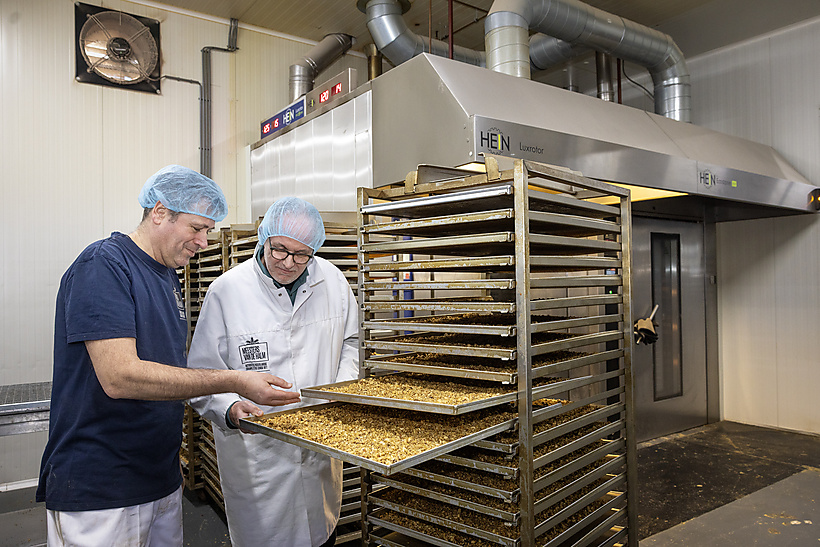 Hij wijst naar de overkant. “We verhuizen over een half jaar wel met de bakkerij, mueslimengerij, glutenvrije ruimte en opslag naar dat pand aan de overkant. Met 650 zonnepanelen op het dak gaan we er onze eigen energie produceren. Dat is nodig, want onze ovens draaien nu nog op gas. De volgende generatie ovens wordt dus sowieso elektrisch. Restwarmte hergebruiken we al en reststromen gaan naar diervoer of biogas. We doen aan verduurzaming wat kan, stap voor stap.”